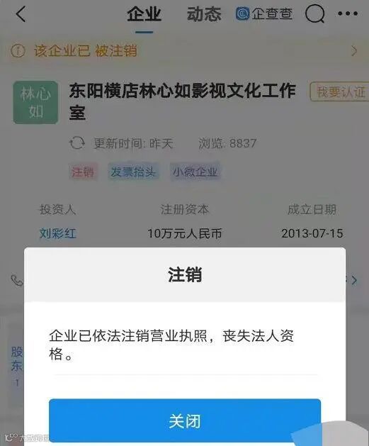 此外,中新经纬注意到,8月底,林心如所关联的东阳横店林心如影视文化工作室发生工商变更,企业状态也由存续变更为注销,注销原因为决议解散;此前,林心如丈夫霍建华所关联的工作室也于2020年底注销。