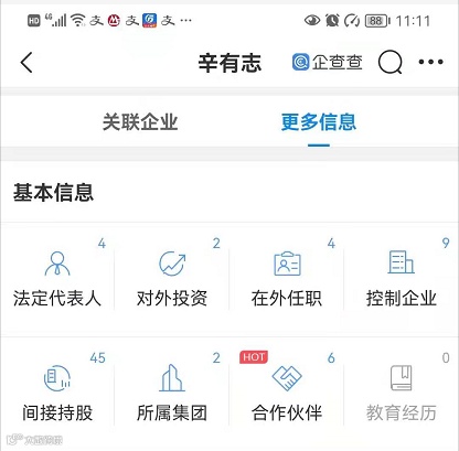 企查查信息显示,辛巴担任法人的企业有4家,对外投资企业2家,在外任职4家,控制企业9家,间接持股的企业则多达45家。
