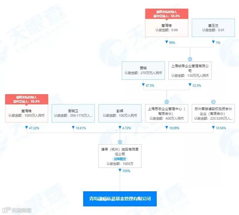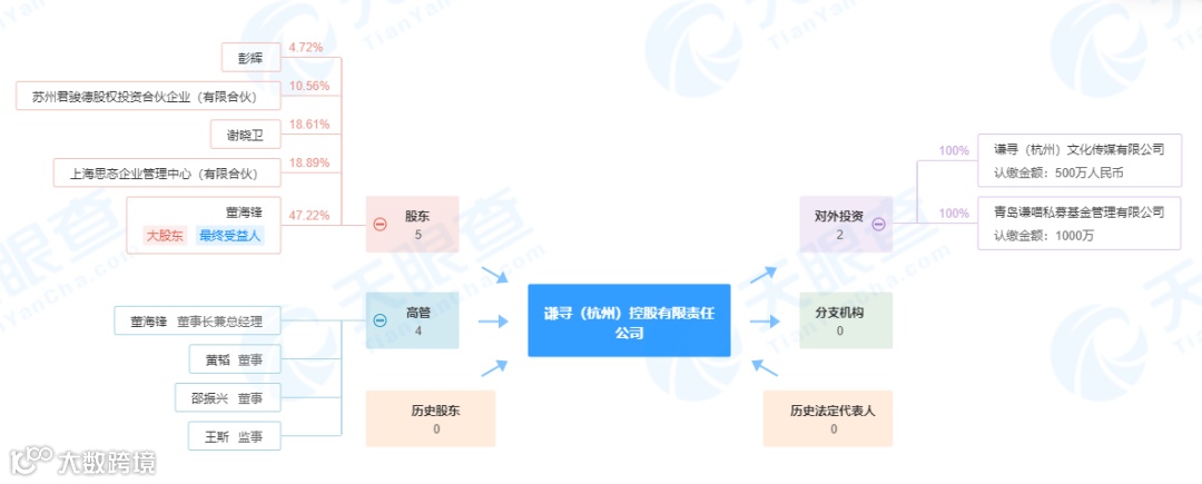 除了新成立的青岛谦喵私募基金管理有限公司外,天眼查显示,谦寻控股目前还100%控股谦寻(杭州)文化传媒有限公司,实际控制人为董海锋。