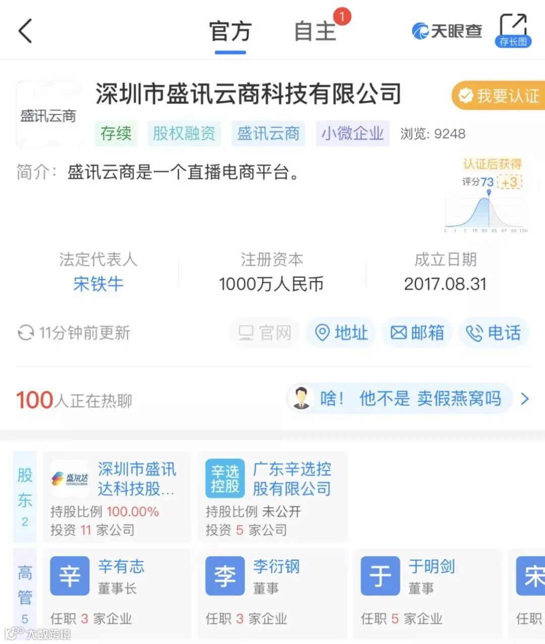 此外,辛巴还担任着电商直播平台盛讯云商的董事长一职。