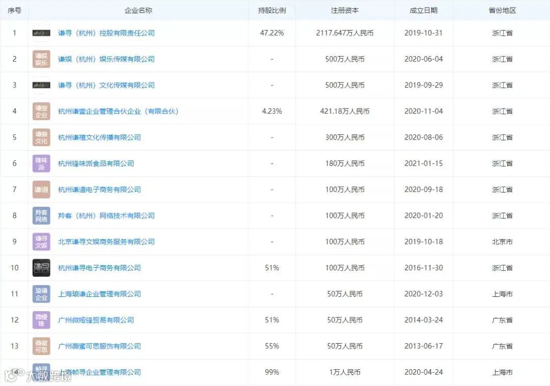 2021年1月15日,杭州锋味派食品有限公司成立,法定代表人同样为董海锋,经营范围包括食品经营、食品农产品零售、食品农产品批发、服装服饰批发等。穿透后,杭州锋味派食品有限公司由谦寻(杭州)文化传媒有限公司100%持股。
