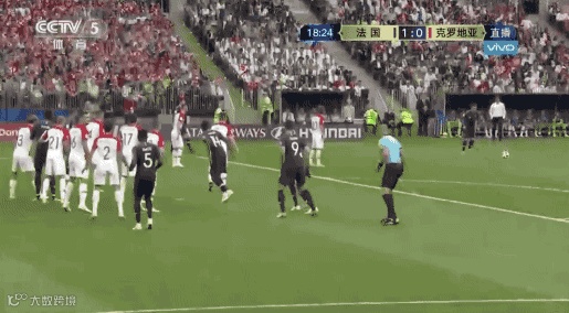 开场后两队都非常谨慎,都没有获得很好的射门良机。比赛第18分钟,法国队获得前场任意球,格里茨曼开出任意球,在禁区内参与防守的克罗地亚前锋曼朱基奇头球后蹭,却不慎自摆乌龙。法国队取得领先。