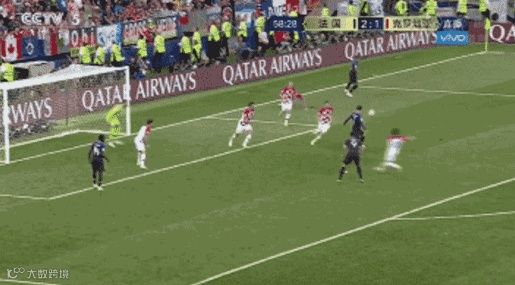 下半场一开场,克罗地亚就阵型前压,加强攻势。第59分钟,波巴后场长传姆巴佩,后者依靠速度优势得球后传中,格里茨曼做球,波巴连续两次远射攻破苏巴西奇的十指关。法国3-1领先。
