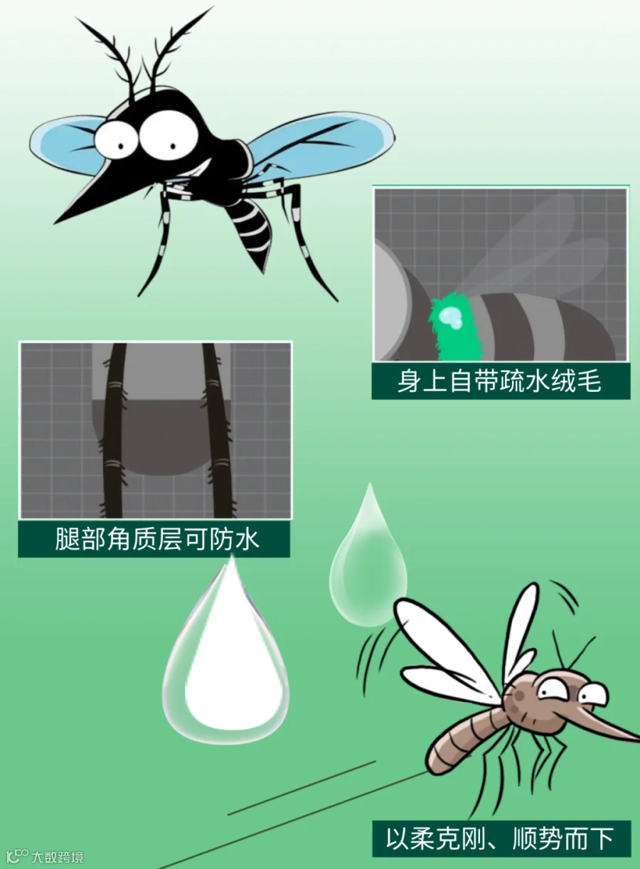 每只蚊子的身上都有毛毛,它们小小的身板上覆满了疏水性细毛,而且蚊子的腿部最外层是角质层,同样可以防水,甚至可以站立在水面,所以蚊子甩一甩就可以轻松摆脱雨滴。