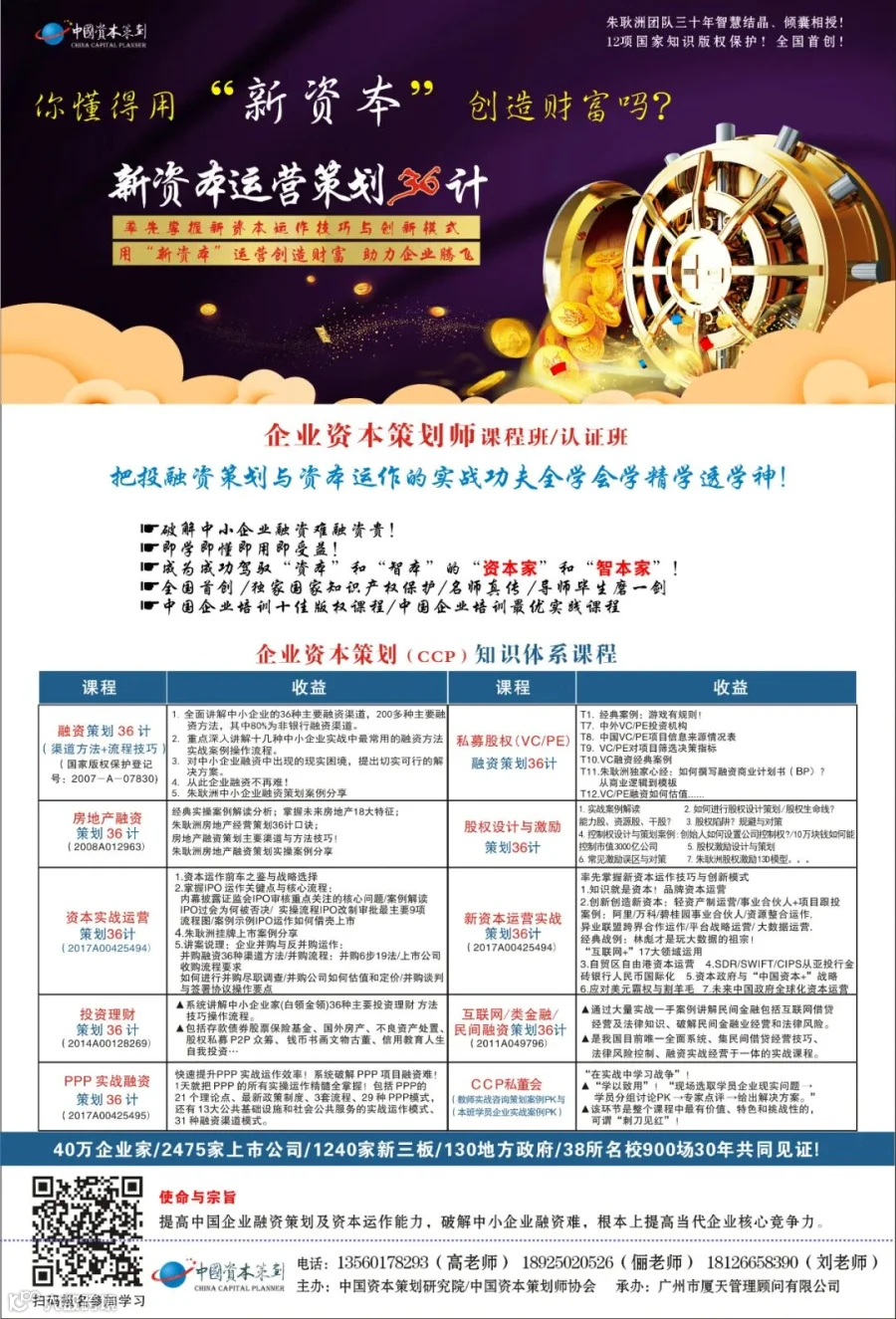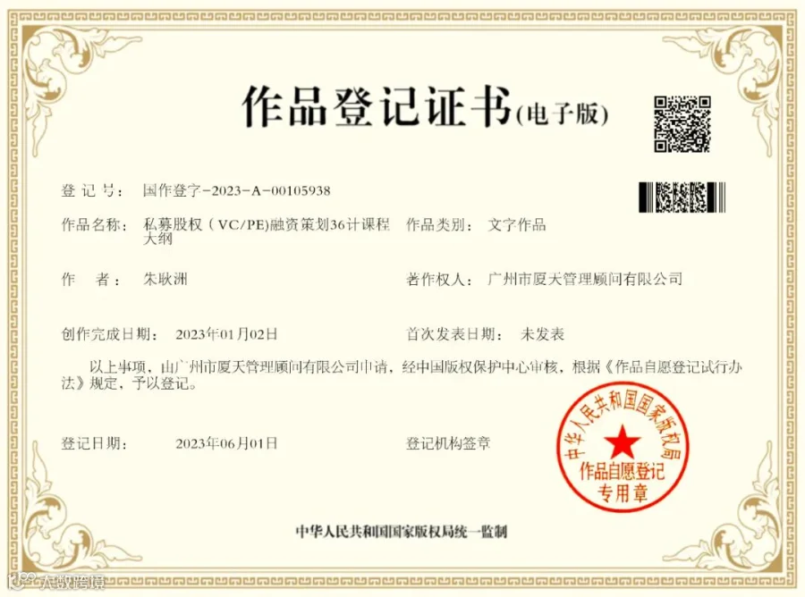 ?怎样少犯错误识别投资骗局?私募股权(VC/PE)融资策划要点与原则是什么?为帮助创业者、企业家解决向VC/PE成功融资的难题,日前,中国资本策划研究院院长、著名资本实战策划专家朱耿洲博士独创的文字作品 《私募股权(VC/PE)融资策划36计》课程,经中国版权保护中心审核登记,正式获得国家知识版权,登记号:国作登字-2023-A-00105938 。这是朱耿洲博士第19项知识版权作品正式出炉,也是朱博士专注于破解中小企业融资难题、提升当代企业核心竞争力方面的又一力作。