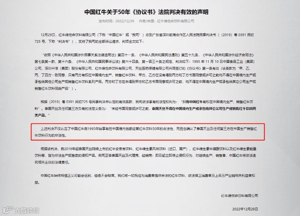 2022年12月29日,中国红牛发布关于50年《协议书》法院判决有效的声明。其中显示,公司收到广东省深圳前海合作区人民法院民事判决书,其中认定了中国红牛自1995年始享有在中国境内独家经营红牛饮料50年的合法性。“只有中国红牛有权在中国境内生产、销售红牛饮料。未经书面同意或许可之前,泰国天丝不得在中国境内生产或承包给其它公司生产或销售红牛饮料同类产品。”