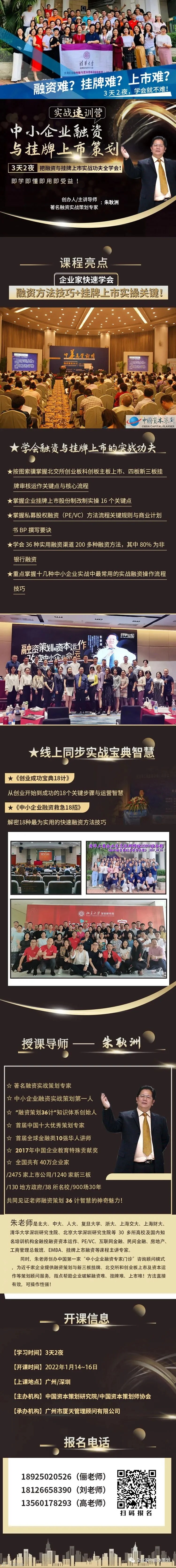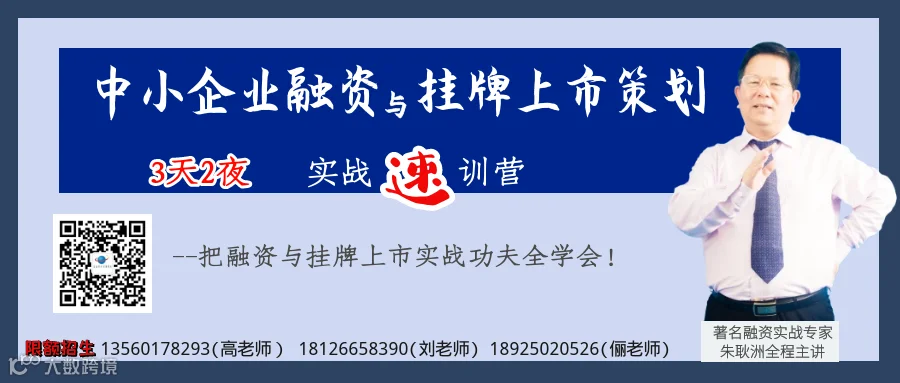 融资难?挂牌难?上市难?其实,学习掌握后就不难。资本策划研究院最新推出的“中小企业融资与挂牌上市策划实战速训营”,就是为了解决这些难题而量身定做的。通过3天2夜的学习,让学员们掌握北交所创业板科创板主板上市、四板新三板挂牌运作关键点与核心流程;还可以学会36种实用融资渠道、200多种融资方法,重点掌握十几种中小企业实战中最常用的实战融资操作流程技巧。让企业家快速把融资与挂牌上市实战功夫一次全学会,让融资与挂牌上市不再难!(公众号:朱耿洲CCP)