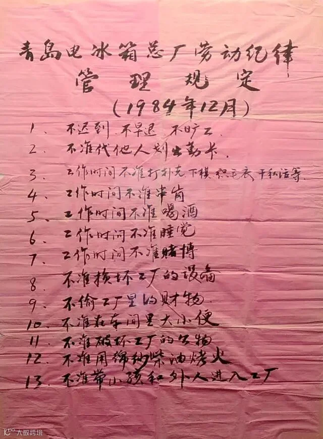 ,其中甚至有一条就是“不准在车间随地大小便”。张瑞敏的规章制度贴出后并没有立即见效,直到他亲自贴出布告将违章工人直接开除,生产秩序才开始好转。