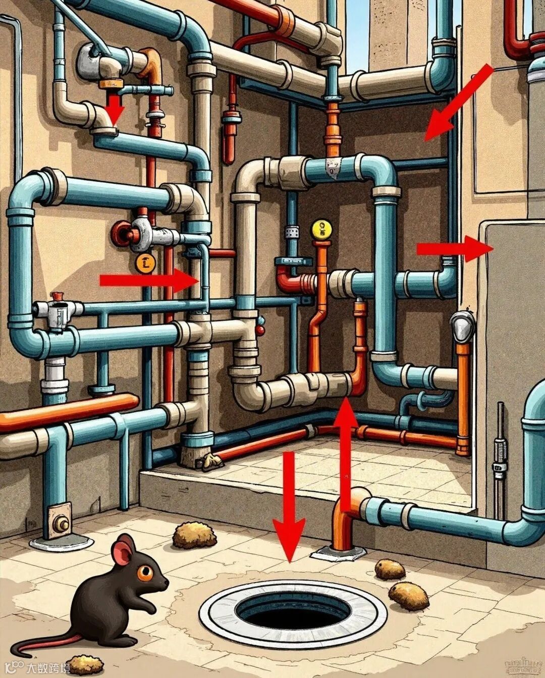 厨房燃气管道、卫生间排水管、排油烟道、自来水管道...这些贯通楼宇的地下网络,是老鼠在楼层间穿梭的VIP通道。任何一处接口的微小缝隙或未封堵的孔洞,都成了它们的“入室安检口”。