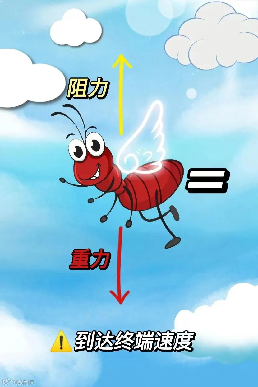 随着蚂蚁的下落速度变得越来越快,蚂蚁所受到的空气阻力将会迅速增加,当空气阻力与重力达到平衡点时,它将不会继续加速,而是匀速下落,此时的匀速飘落在空中的速度被称为:终端速度!