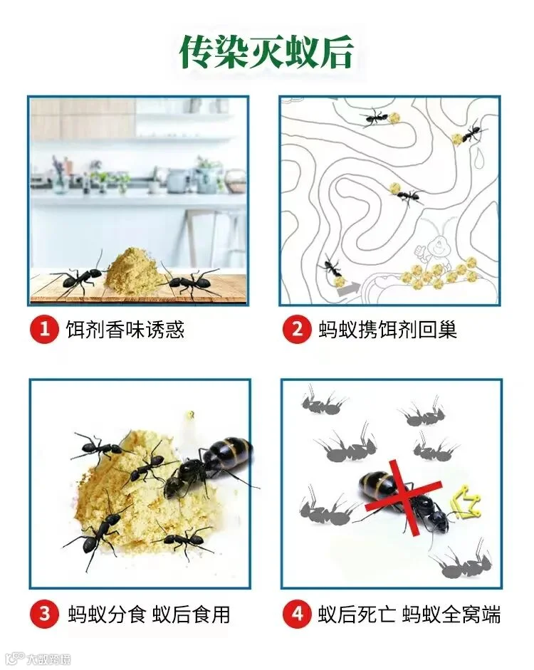 出来觅食的小兵工蚁携带饵剂回巢供蚁后食用,却不曾想给它们带来灭顶之灾,全窝灭亡!