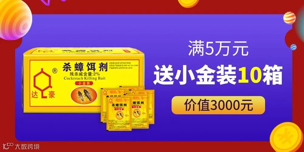 4.本次活动期间每单一客户一次性出货达豪任意产品达5万元(不做累计),加赠3克小金装杀蟑饵剂10箱,价值3000元。