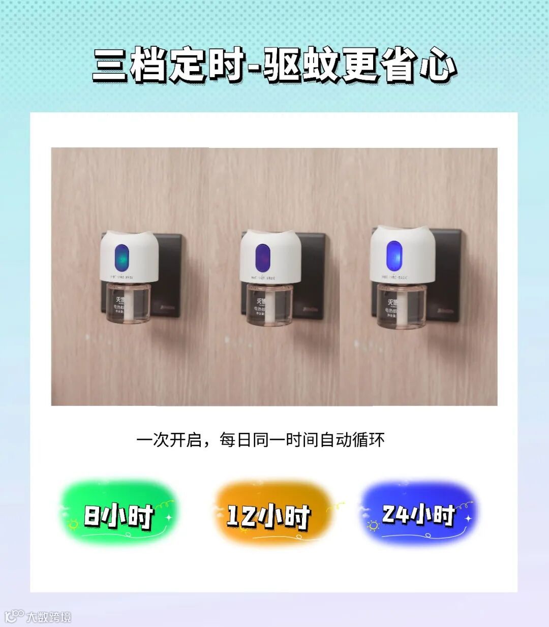 三档定时:💚绿灯8小时模式;💛黄灯12小时模式;💙蓝灯24小时常亮模式。