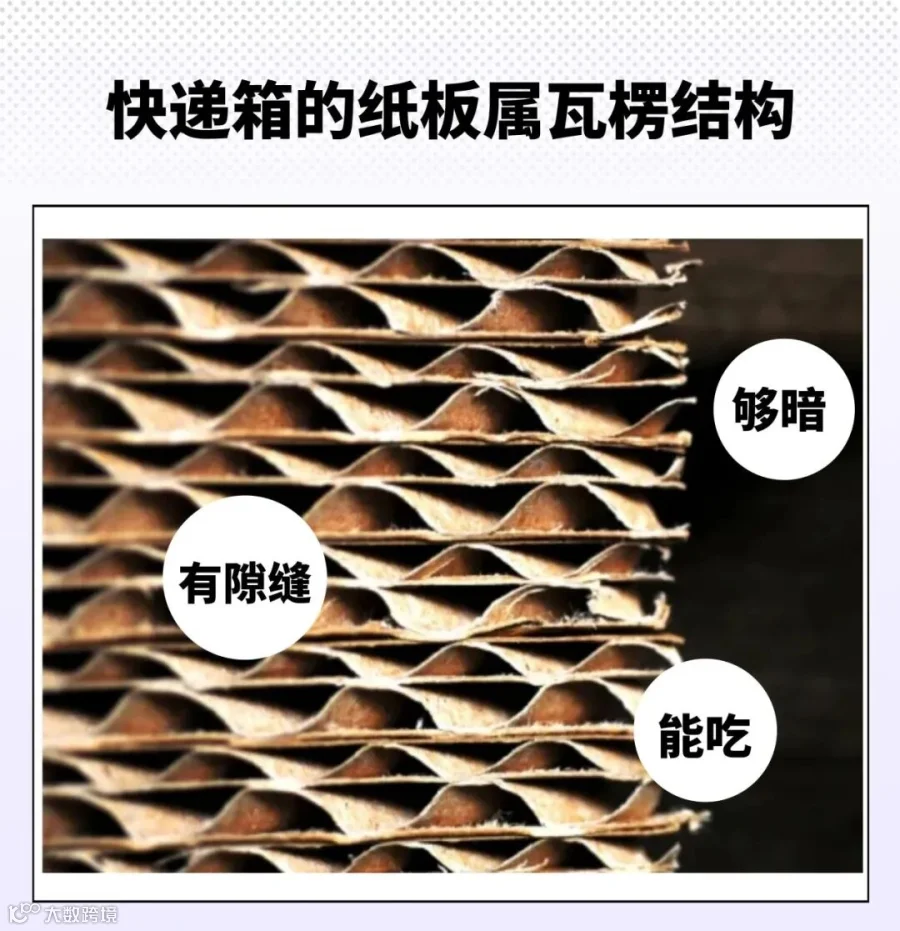 用于制作快递箱的纸板属瓦楞结构,内部空隙大,快递箱本身内部环境阴暗、容易受潮,这些特点为蟑螂的栖居和繁殖创造了条件。再加上蟑螂什么都吃的生存技能,纸箱也成了它的食物来源。