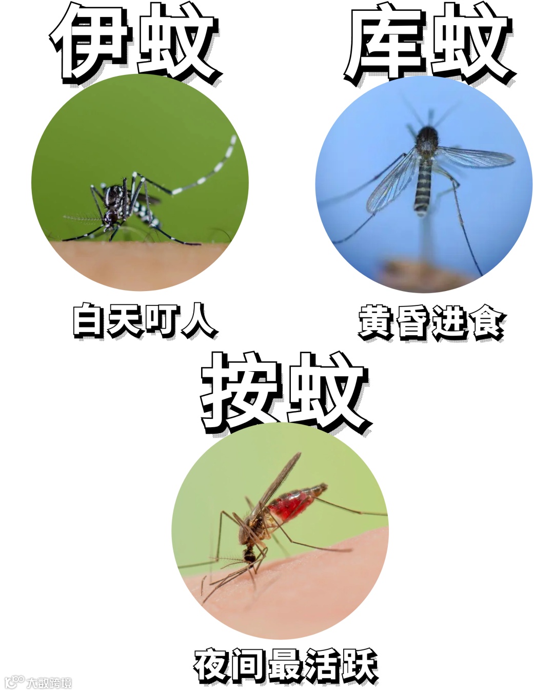 伊蚊在白天叮人 ,库蚊在黄昏进食 ,而按蚊在夜间最活跃。