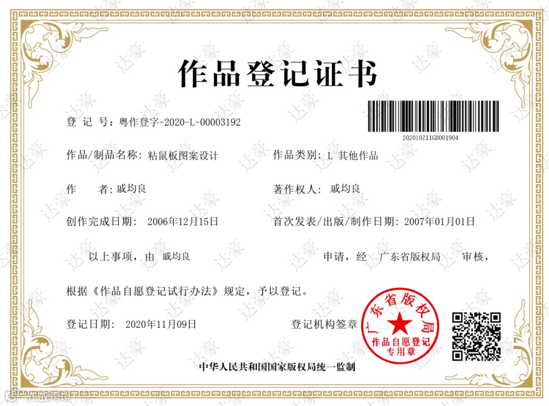 开平市达豪日化科技有限公司(以下简称达豪)已获得“粘鼠板图案设计”著作权。他人以任何形式、任何理由的各种仿冒行为,均为
