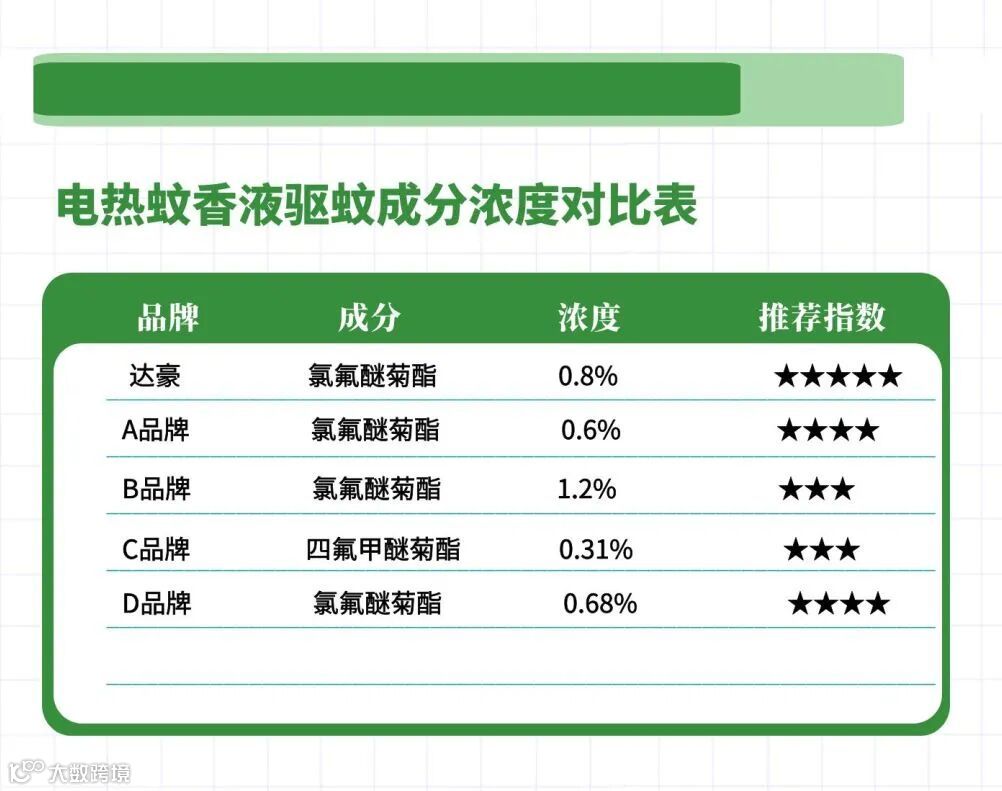 我们对比了市场上一些知名品牌的同类电蚊液,发现达豪的0.8%的驱蚊配方浓度刚刚好!