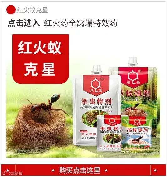 当发生区域蚁巢密度较高的时候用粉剂处理更方便,在施药时现在蚁巢周围撒上一圈粉剂封堵蚁巢周围的蚁道,防止红火蚁外逃。挖开地面上的蚁丘,红火蚁蜂拥而出时迅速撒上粉剂,沾满粉剂的红火蚁钻回巢穴后与其他红火蚁通过身体接触不断的将粉剂传递给另外的个体,这样经过5-10天可杀灭85-90%的红火蚁蚁群。