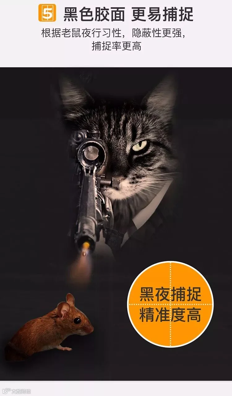 形容一个人目光短浅,缺乏远见时,大抵用“鼠目寸光”这个词。许多家鼠虽然视力不佳,也不至于只有寸光。由于它们在夜间活动,对光线还是敏感的。即使在黑暗处,也能看见10米以内的移动物体。不过,家鼠都是全色盲——完全性视锥细胞功能障碍,与夜盲恰好相反,尤喜暗、畏光,表现为昼盲。七彩世界在老鼠眼中是一片灰暗,如同观黑白电视一般,仅有明暗之分,而无颜色差别。因此,使用黑色的胶面,隐秘性更强,成功捕捉率更高。