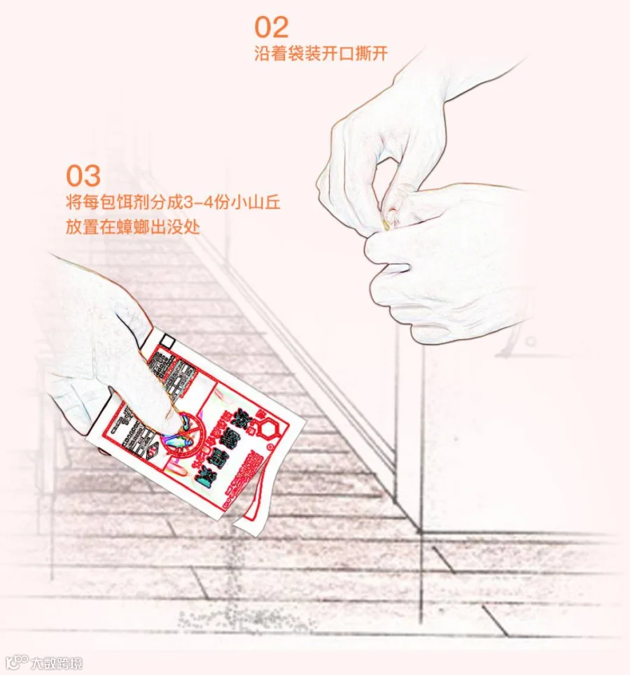 轻轻在角落撒上3-5包香味增强型杀蟑饵剂,