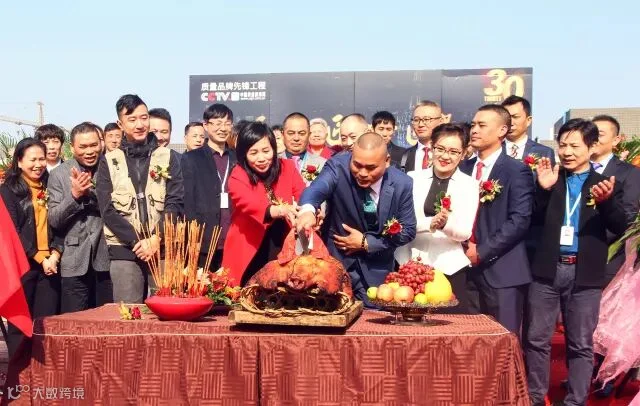 (戚均良董事长携董事长夫人一同切烧猪,祝贺开机顺利)