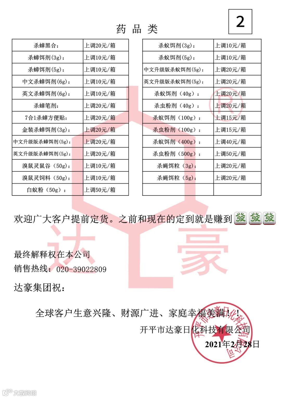 达豪系列产品调价通知
