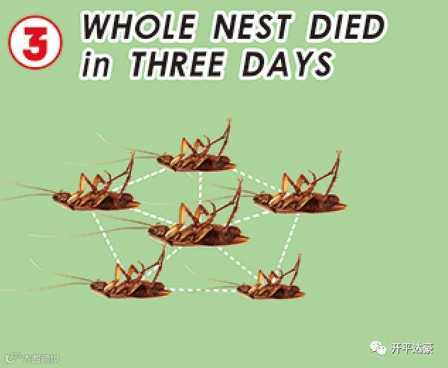 由于死蟑螂体内还残留着药物,活蟑螂残食同伴尸体或者排除它们的粪便时,病毒会转移到自己体内,从而达到全军覆灭的效果。