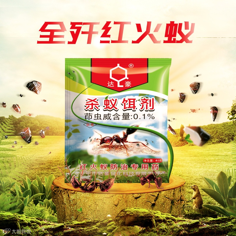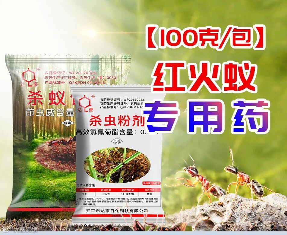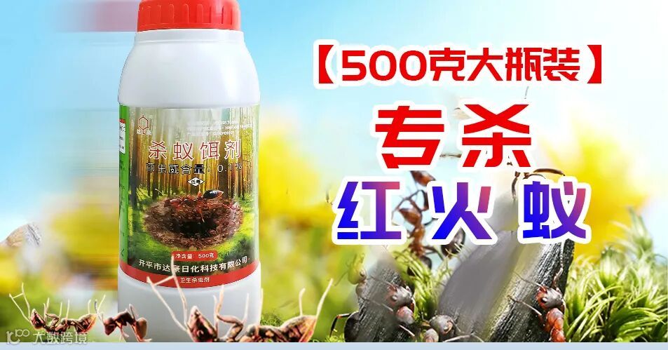 达豪0.1%茚虫威杀蚁饵剂为高效及环境友好型杀红火蚁饵剂。在对环境友好药物中选取有效成分;通过对多种物料的合理配伍,形成对红火蚁适口性特别优良的诱饵,使药饵做到对红火蚁的引诱力、饵料被搬回巢消耗速度和现场防控效果三个方面对现有产品的超越。产品配方已申报发明专利,