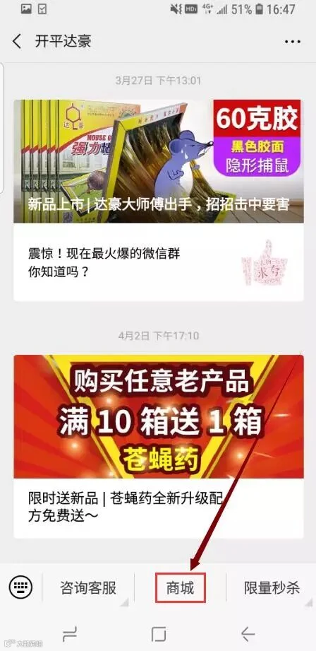 1、打开“开平达豪”公众号,点击下方的“商城”按钮,如图所示: