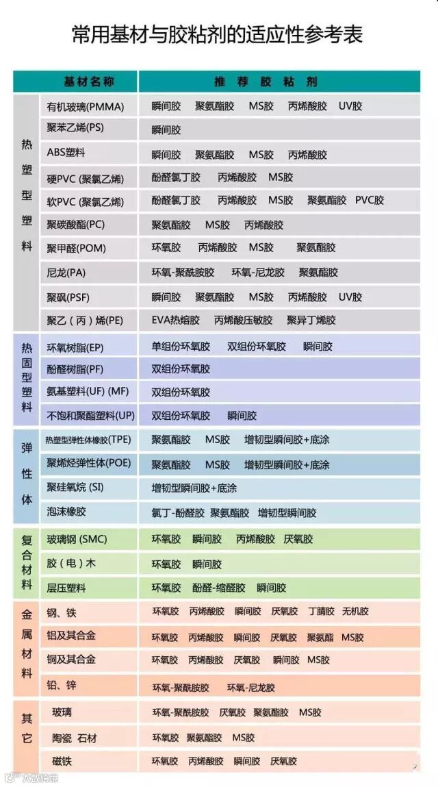 ① 粘接极性材料 (如钢、铝、钛、镁、陶瓷等)推荐选择极性强的胶粘剂,如环氧树脂胶、聚氨酯胶、酚醛树脂胶、丙烯酸酯胶、无机胶等;