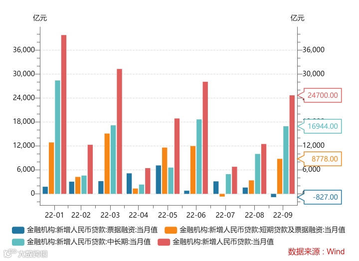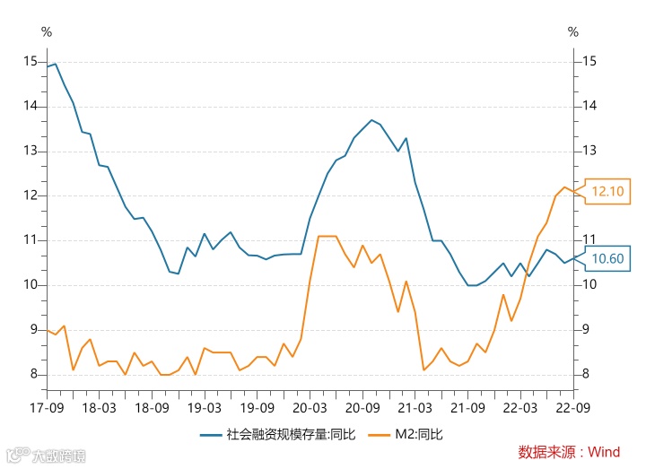 2022年10月11日,央行发布数据显示,9月末,广义货币(M2)余额262.66万亿元,同比增长12.1%,增速比上月末低0.1个百分点,比上年同期高3.8个百分点;社会融资规模存量为340.65万亿元,同比增长10.6%。9月,社会融资规模增量为3.53万亿元,同比多增6245亿元;人民币贷款增加2.47万亿元,同比多增8108亿元。(中国人民银行)