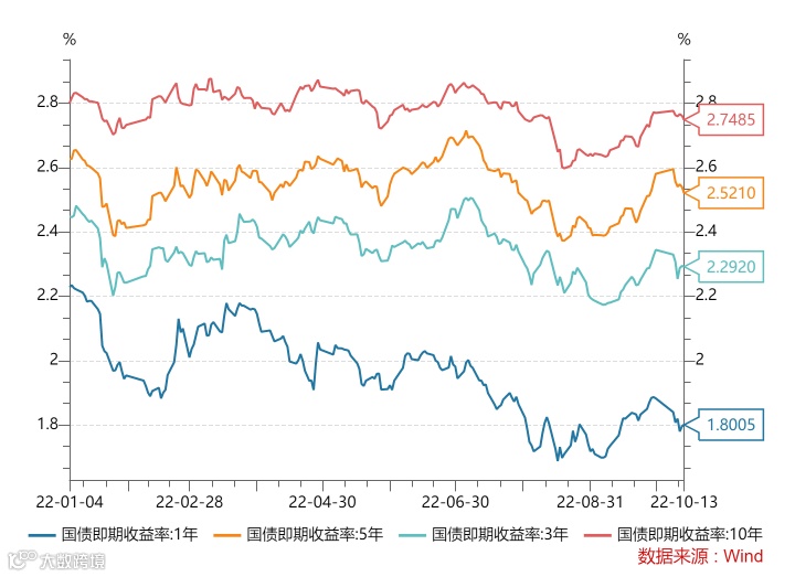 本周一年期国债即期收益率下行至1.80%附近;10年期国债即期收益率小幅下行至2.74%附近。