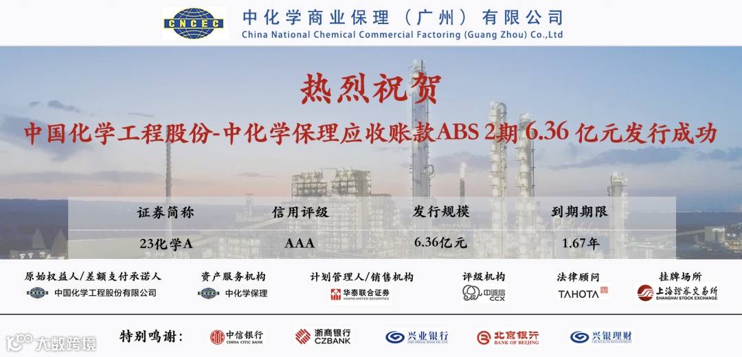 2023年11月10日,由中化学保理作为项目协调人兼资产服务机构的“中国化学工程股份-中化学保理应收账款2期资产支持专项计划”在上海证券交易所成功发行!本期产品发行规模6.36亿元,获得投资者大力支持,充分展示了资本市场对中国化学的高度认可。