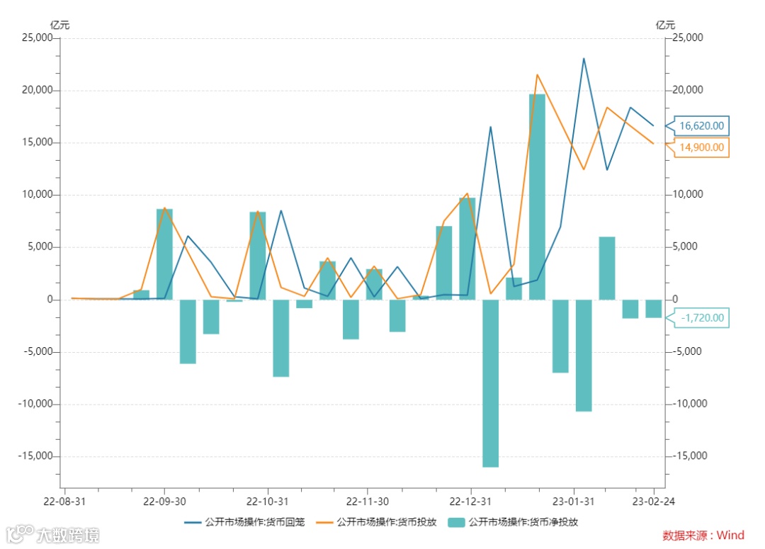 2月24日,央行通过公开市场投放14,900亿元,操作回笼16,620亿元,货币净投放-1,720亿元。