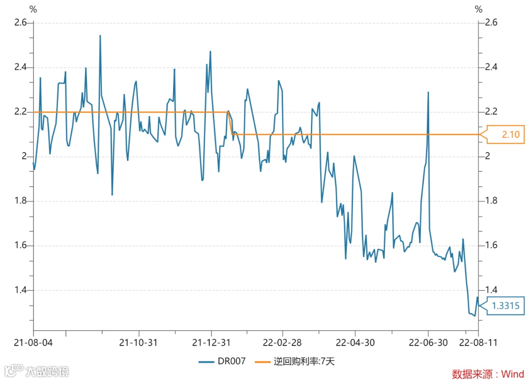 本周(8月5日-8月11日),DR007(银存间7天质押回购利率)在8月5日触及最低点1.285%后缓慢上升至8月11日的1.3315%。进入三季度以来,市场整体资金面一直保持比较宽裕的状况,资金利率达到历史低位。