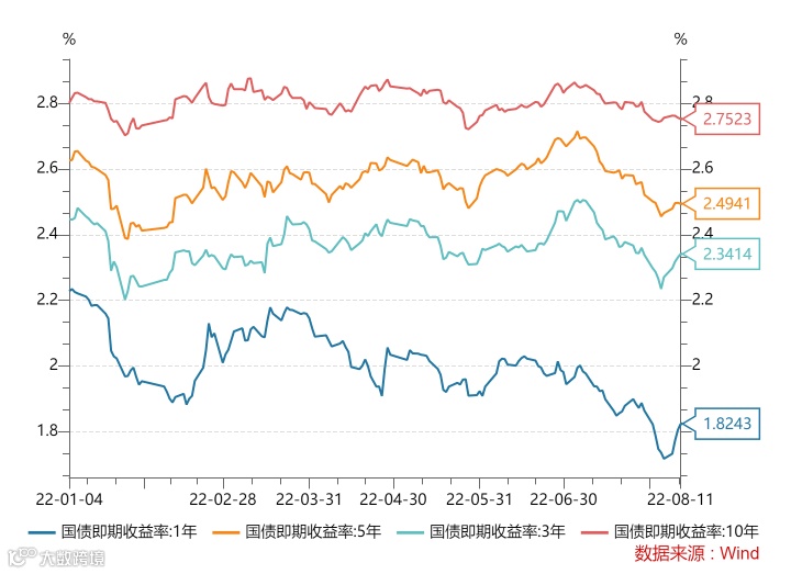 本周各期限国债即期收益率上行。1年期即期收益率提升至1.82%附近,10年期国债即期收益率保持在2.75%附近。