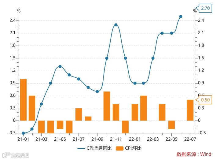 8月10日,国家统计局公布7月份全国CPI(居民消费价格指数)和PPI(工业生产者出厂价格指数)数据。7月份CPI同比2.7%,较6月份上升0.2%;环比上升0.5%,高于季节性(历史同期均值为0.3%)。猪肉和鲜菜价格上涨显著超过季节性,拉动CPI环比上涨;国际油价下跌拉低CPI环比。总体来说,内需依旧疲弱。