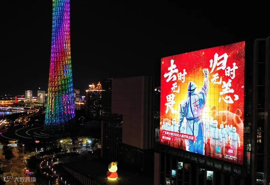 此外,在广东省委宣传部的指导下,在各地市委宣传部的积极参与下,去年最大的抗疫公益广告也在媒体港户外大屏温情上演,最美逆行者们点亮了夜空,温暖了人心。