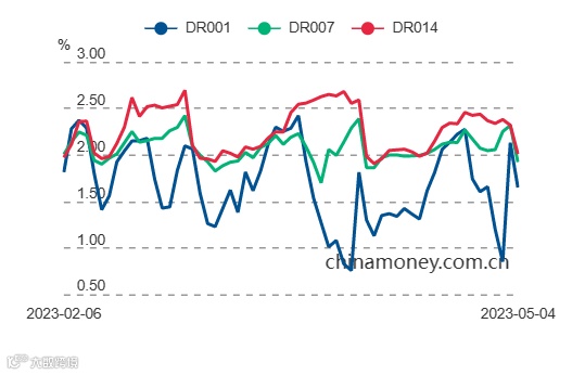 截至5月4日,DR001加权利率1.6478%,DR007加权利率1.9212%,DR014加权利率2.0072%。