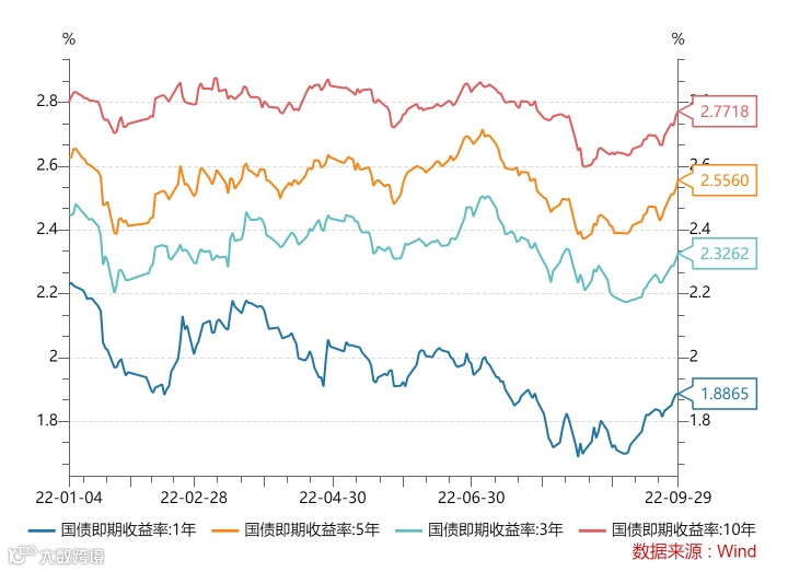 本周各期限国债即期收益率仍保持上行趋势。1年期即期收益率抬升至1.88%附近,10年期国债即期收益率抬升至2.77%附近。