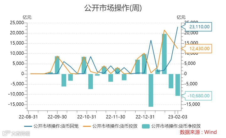 2月3日,央行通过公开市场投放12,430亿元,操作回笼23,110亿元,货币净投放-10,680亿元。