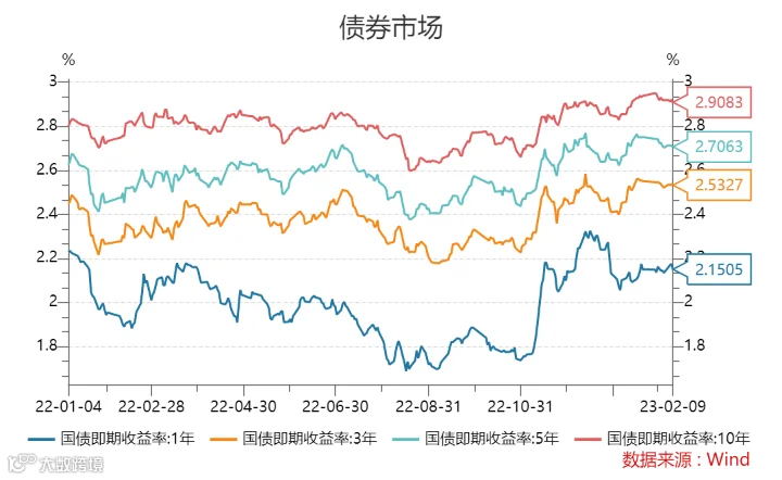 本周国债即期收益率小幅回落,2月9日,1年期国债即期收益率2.1505%,10年期国债即期收益率2.9083%。