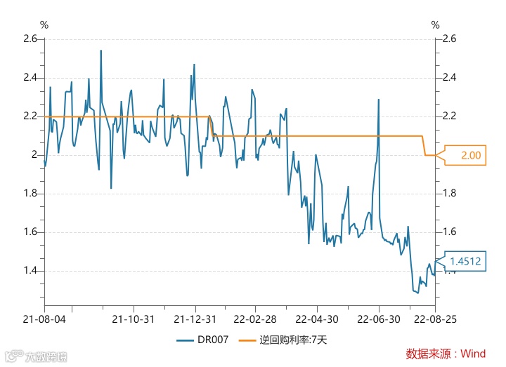 本周(8月19日-8月25日),DR007(银存间7天质押回购利率)小幅震荡向上,25日收于1.4512%。
