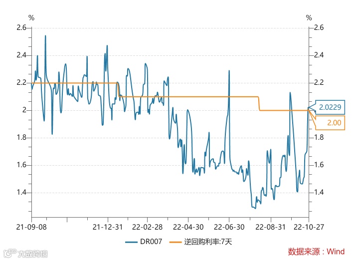 本周(10月21日-10月27日),DR007(银存间7天质押回购利率)较上周(10月14日-10月20日)出现一路大幅上行趋势,10月27日收于2.0229%。