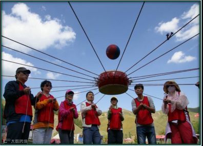 凝聚力与向心力,所有人手拉手围成一圈,松开手,每人握住绳子的一部分围成一个圆,双脚合并,用脚后跟着地,所有人同时向后倒,让一个最重的人在这个绳子上走一圈。在走完这一圈的过程中是不能掉下来的。
