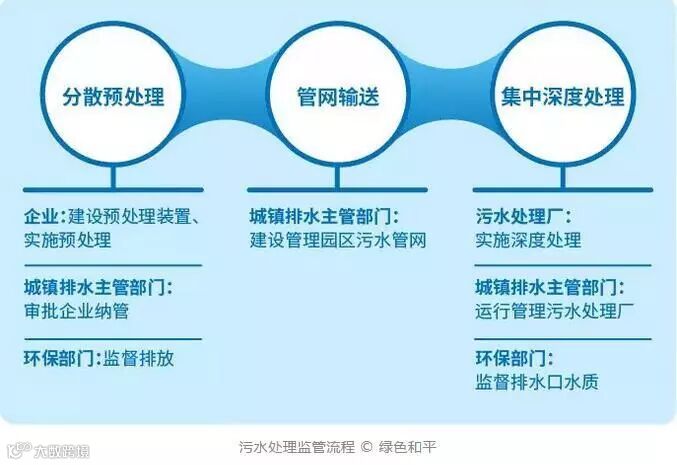 工业污水处理管理一般分为分散预处理、管网输送和集中深度处理三个环节。在预处理环节,污水分散预处理由企业自行完成,预处理排放情况由环保部门监督;在管网输送环节,企业纳管由城镇排水主管部门审批管理,园区污水管网由城镇排水主管部门建设和运行管理;集中深度处理主要由污水处理厂完成,污水处理厂由城镇排水主管部门运行管理,而污水处理厂排放口出水水质由环保部门监督。在这三个环节中,污水处理管理由多个单位负责,管理与监督较为分散,这也是污水集中处理问题频发的根源。