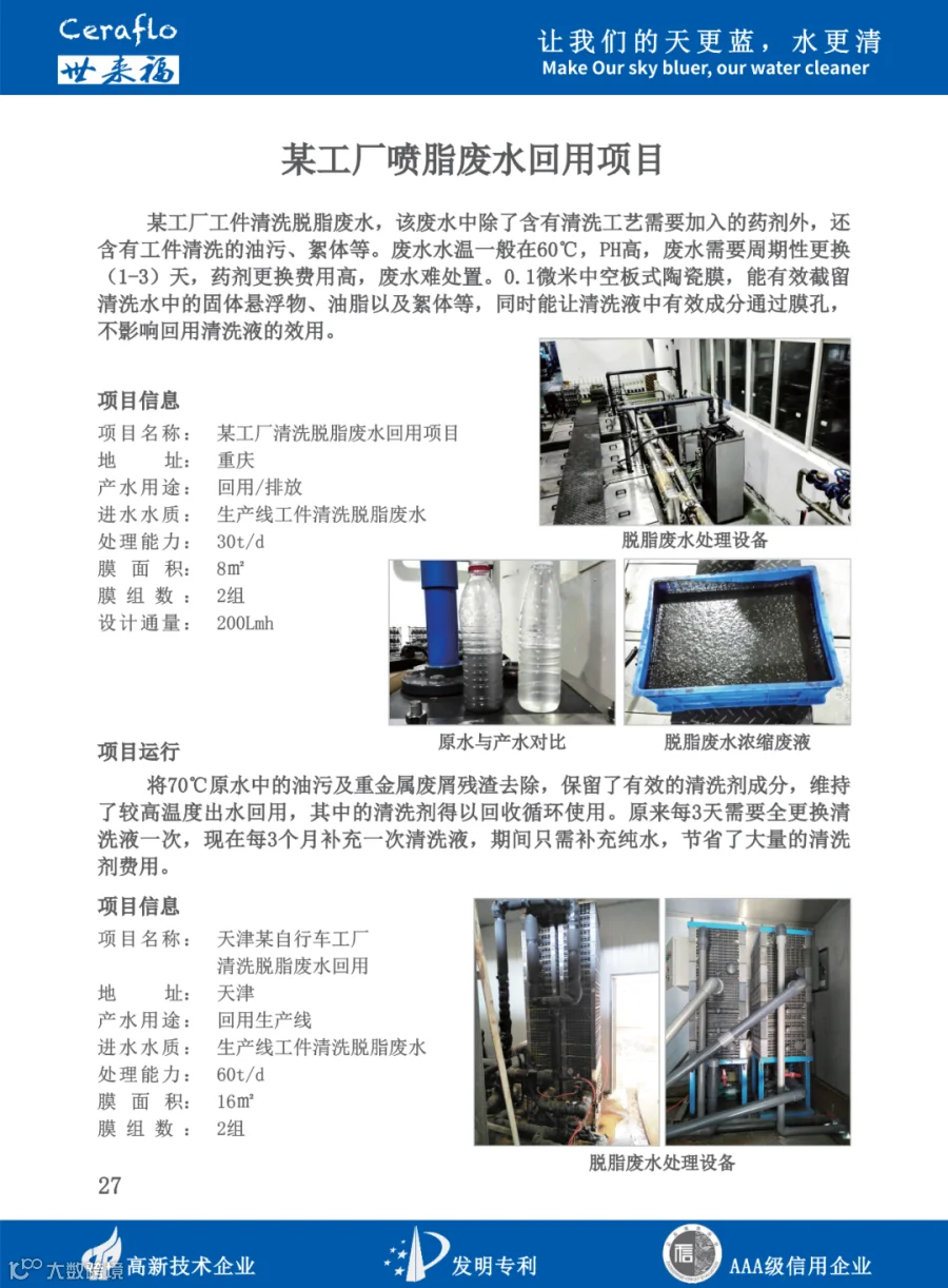 目前公司有污泥压滤低温真空干化系统、MABR、IOSBR及柔性陶瓷膜直滤系统及PTFE亲水MBR膜等多个拳头产品。可应用到以下多个行业:在切割、脱脂、除油、电镀、印染、晶圆、油田回注水、矿井水等工业废水领域取得丰硕成果。