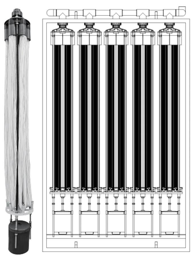 Ceraflo-MBR膜是一种以PTFE为原料的中空纤维膜,既有有机膜的柔性,又有无机膜的强度,是一种亲水角为0°的超亲水膜。具有材料稳定、抗压强度高、耐受性强及膜通量大等特点。目前的MBR膜分为柱式及帘式两种结构。
