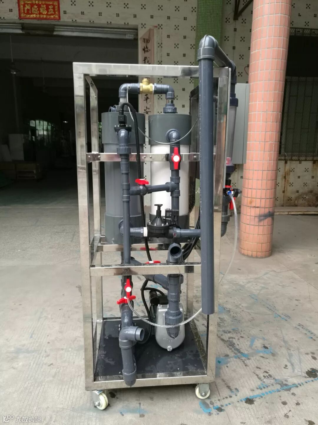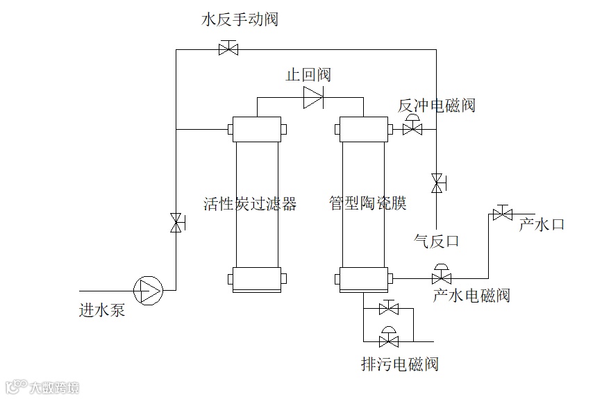 设备占地面积小,约为0.4㎡,尺寸为Ф240×800mm的活性炭罐和管型陶瓷膜能达到与传统炭滤、砂滤罐相近的产水量;