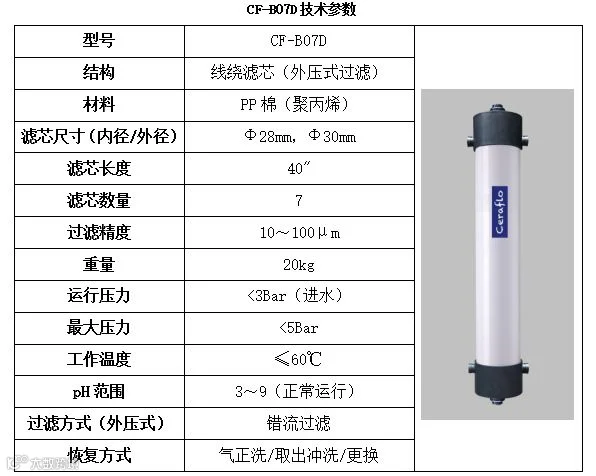 Ceraflo保安过滤器由7根线绕滤芯组装而成,过滤精度为10μm~100μm,可有效截留水中胶体、铁锈、泥沙、虫卵等大颗粒物质。具有以下4个特点:集表面、深层、粗精滤为一体,可充当预处理设备,替代土建的前置过滤处理工艺;颗粒在滤芯孔道中发生架桥现象,使小于孔道的颗粒也能被拦截;清洗容易,操作简单,通过气振洗产生气泡,振动清除滤芯表面污染物,水质稳定,维护方便;滤芯成本低廉,更换简便(2~3个月更换一次滤芯),膜壳可循环利用。